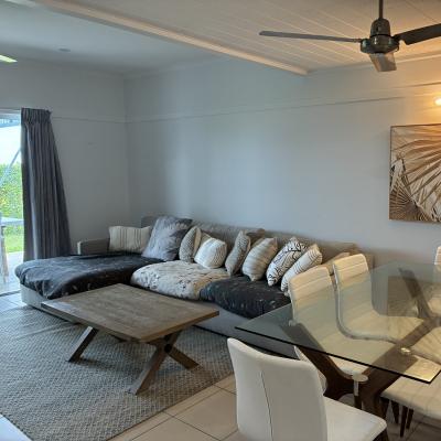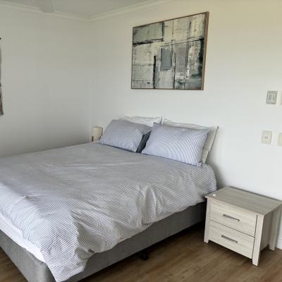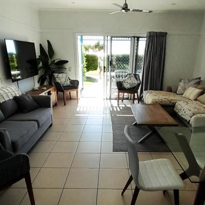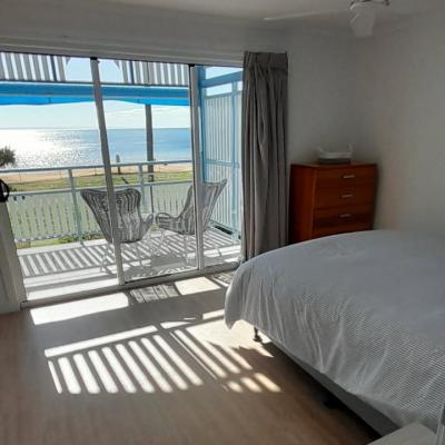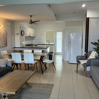 The ground level features a large, open-plan living and dining area that flows into a generously sized, fully self-contained kitchen. Upstairs, you will find the bedrooms and an expansive deck, ideal for soaking in the spectacular sunsets and panoramic views across Moreton Bay. Please note the dolphin feeding package is not available to guests when staying in this privately owned villa.